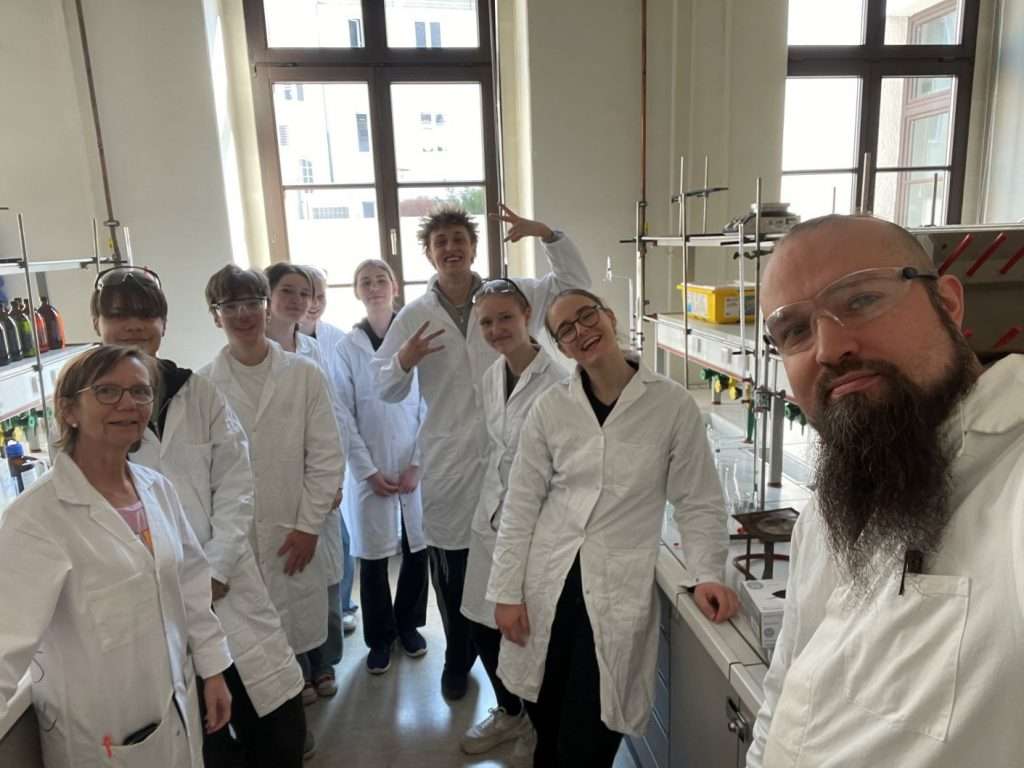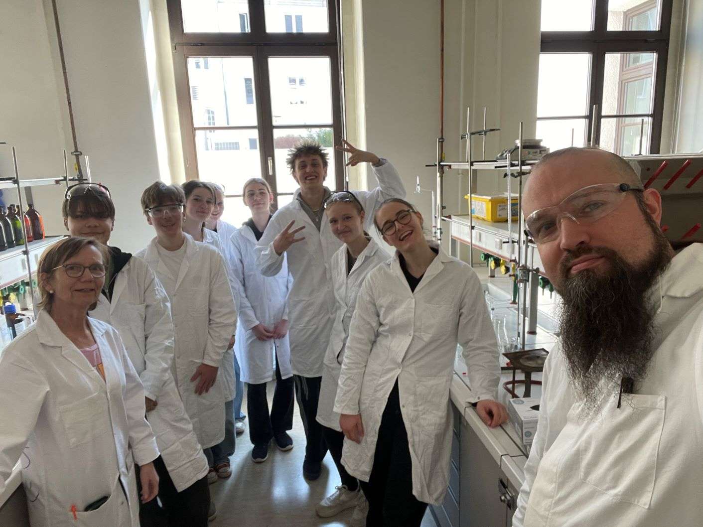 Die Schülerinnen und Schüler des Grundkurs Chemie 11 verbrachten den Tag der Naturwissenschaften im Labor der TU Chemnitz mit spannenden Experimenten.