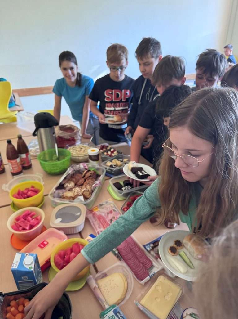 Bevor wir uns auf den laaangen Weg machten, starteten wir mit einem gemeinsamen Frühstück in der Schule. Jeder brachte etwas Leckeres mit: Erdbeeren, Piccolinis, Brötchen und noch vieles mehr.