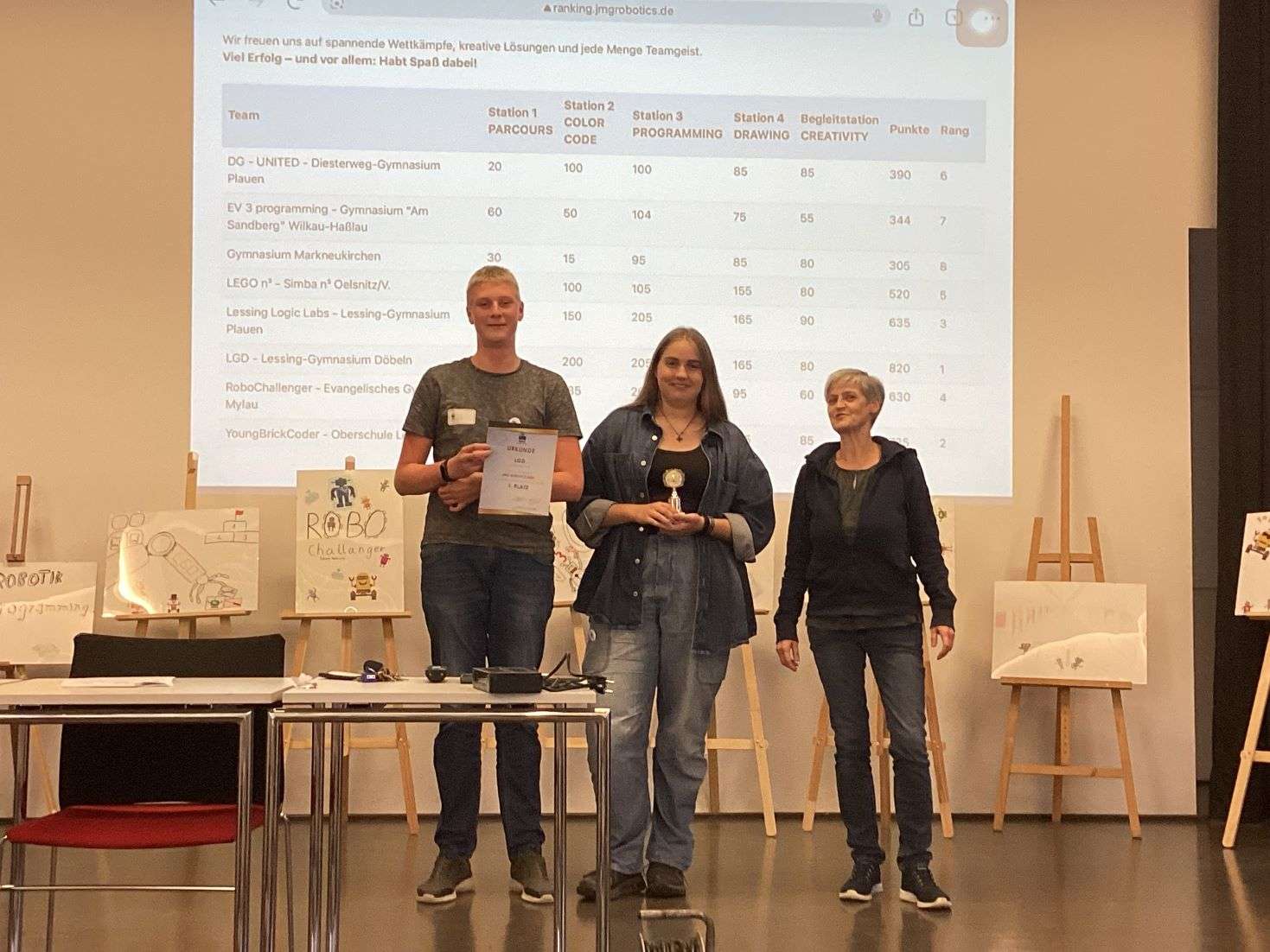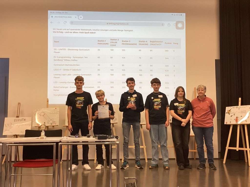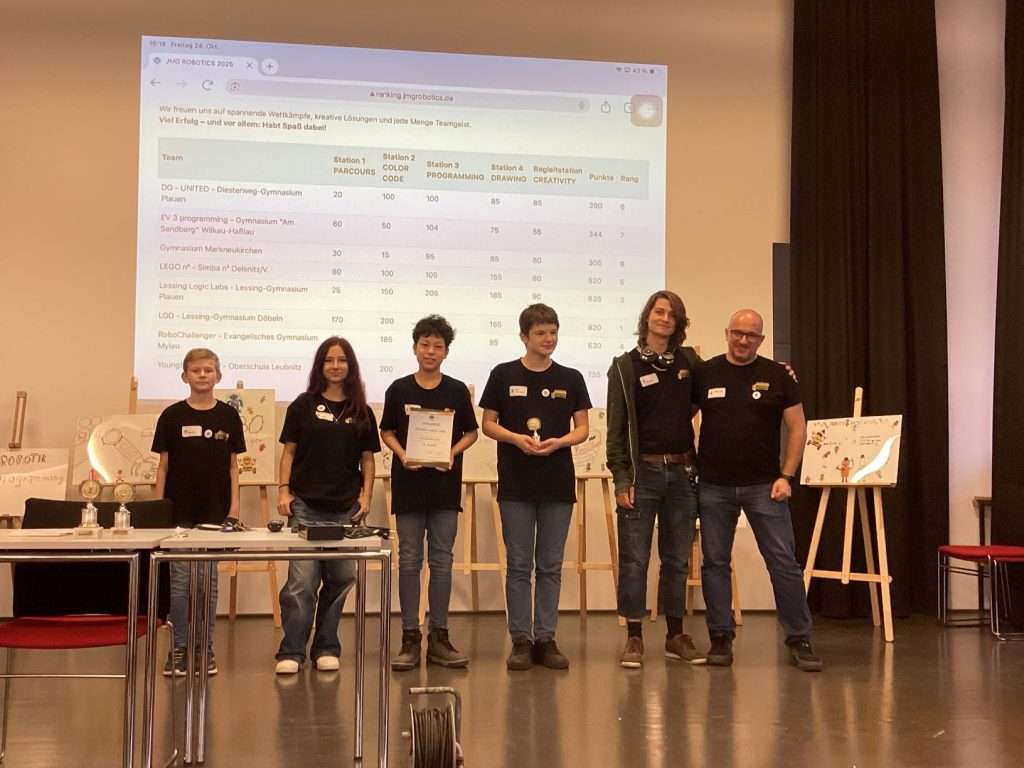 Gegen 16:00 Uhr begann die Siegerehrung – und die Spannung war greifbar. Schließlich stand das Ergebnis fest: mit 820 von 905 möglichen Punkten sicherte sich das Team LGD den Gesamtsieg und durfte stolz den JMG ROBOTICS-Pokal 2025 in Empfang nehmen.