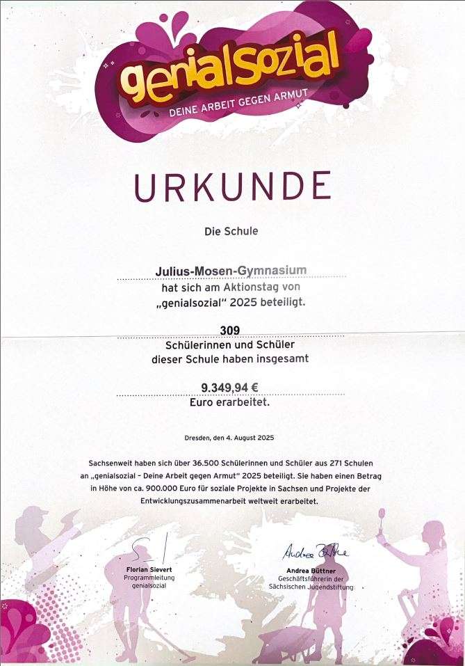 Auch in der letzten Schulwoche des vergangenen Schuljahres beteiligten sich unsere Schülerinnen und Schüler der Klassenstufen 7-11 wieder an der Aktion „genial sozial“ der sächsischen Jugendstiftung und tauschten einen Tag die Schulbank gegen einen Arbeitsplatz. Neben vielen spannenden Erfahrungen, die die Jugendlichen machen konnten, erarbeiteten sie auch eine ansehnliche Summe, die nun sozialen Projekten zu Gute kommt.