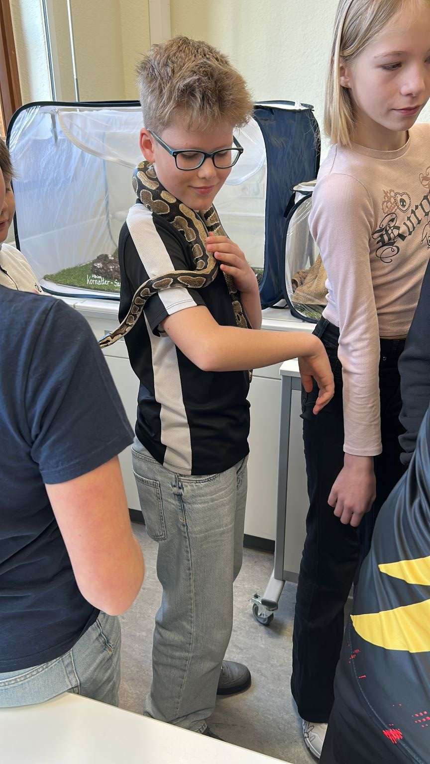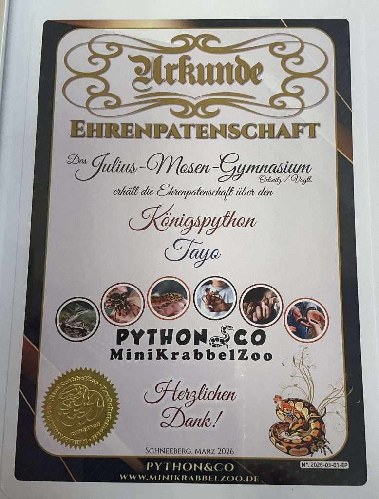 Herr Renner vom Minikrabbelzoo Schneeberg übertrug uns zu seinem Besuch beim Tag der Naturwissenschaften die Ehrenpatenschaft für seinen Königspython Tayo.