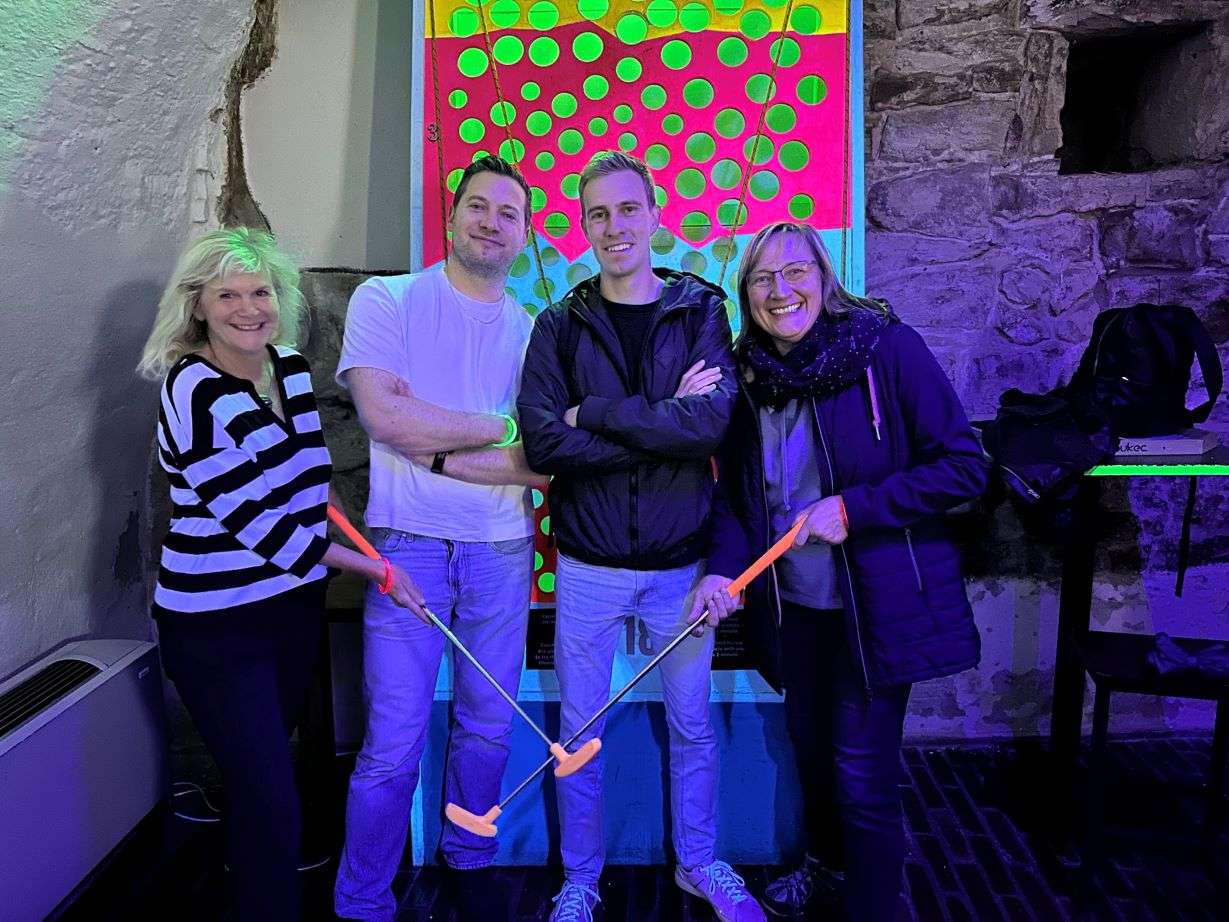 Den Mittwoch starteten wir mit einer spannenden Runde Lasergame, bevor wir am Nachmittag gemeinsam über die eindrucksvolle Karlsbrücke, mit Blick hoch zu unserem Ziel, der Prager Burg, spazierten. Vorbei an der John Lennon Wall und dem Kleinseitner Ring mit der dominanten Kirche St. Nikolaus, genossen wir den beeindruckenden Blick über die Stadt und schlenderten anschließend durch das berühmte Goldene  Gässchen. Mit nun schon fast 20.000 Schritten auf der Uhr ließen wir auch diesen Tag langsam ausklingen. Am Donnerstag stand Schwarzlicht-Minigolf auf dem Programm: Beim Betreten der Räume tauchten wir in eine bunte Welt, die im Dunkeln Prag schimmernd widerspiegelte. Die außergewöhnliche Atmosphäre sorgte sofort für gute Laune – das Spiel brachte uns alle zum Lachen und stärkte noch einmal den Teamgeist. Der letzte Abend ging vorüber, unsere Reise zog wahrhaftig schnell an uns vorbei!