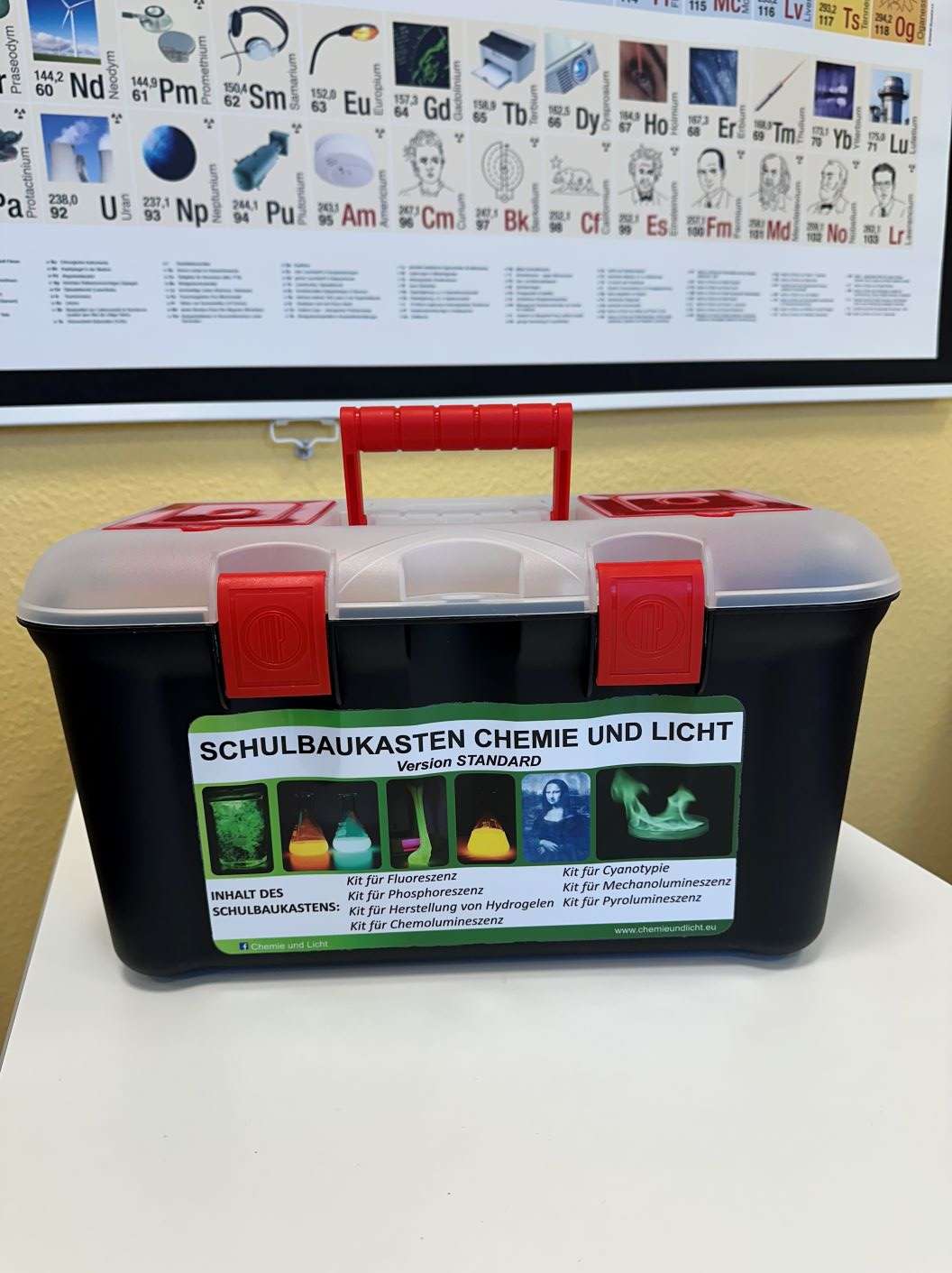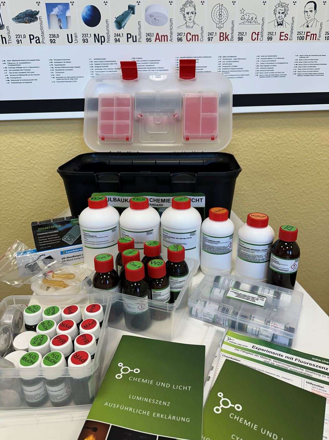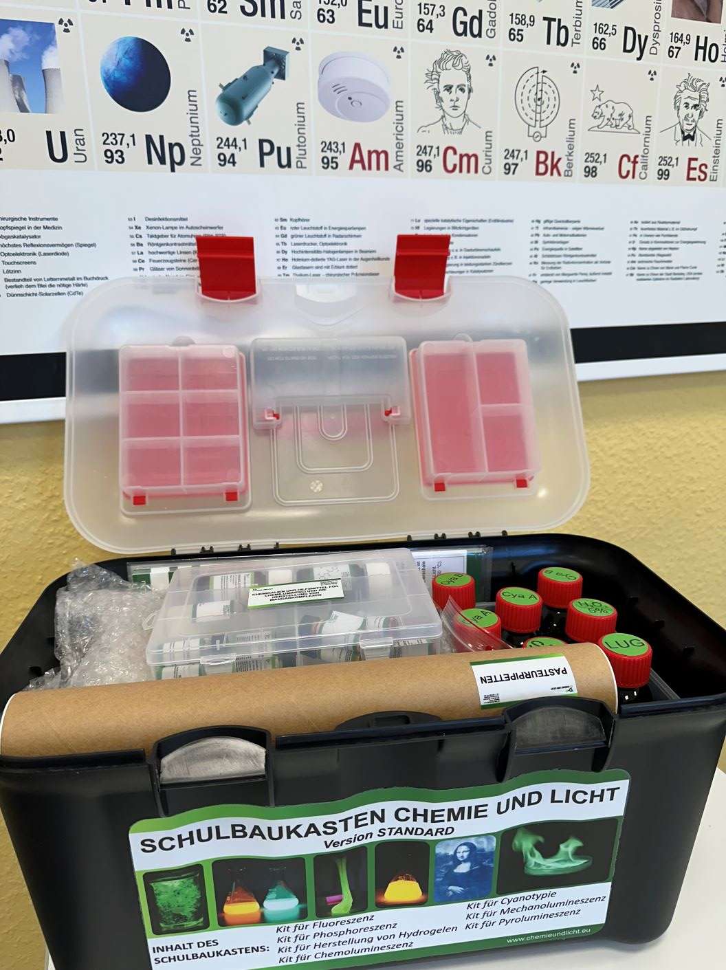 Bewerbung erhielt, wurde aufgestockt (FONDS DER CHEMISCHEN INDUSTRIE im Verband der Chemischen Industrie e.V. ). Da schon eine „Wunschliste“ in der Fachschaft vorlag, ging dann alles relativ schnell: mit dem Geld des Förderfonds wurden zwei spezielle Experimentierkästen angeschafft, die einerseits das fächerübergreifende Lernen (Chemie, naturwissenschaftliches Profil, Kunst) intensivieren sollen, andererseits werden bisher nicht durchführbare Phänomene auf praktische Weisen den Lernenden erfahrbar gemacht – und diesen sind besonders spannend. Bei beiden spielt das Thema „Licht“ eine Rolle.