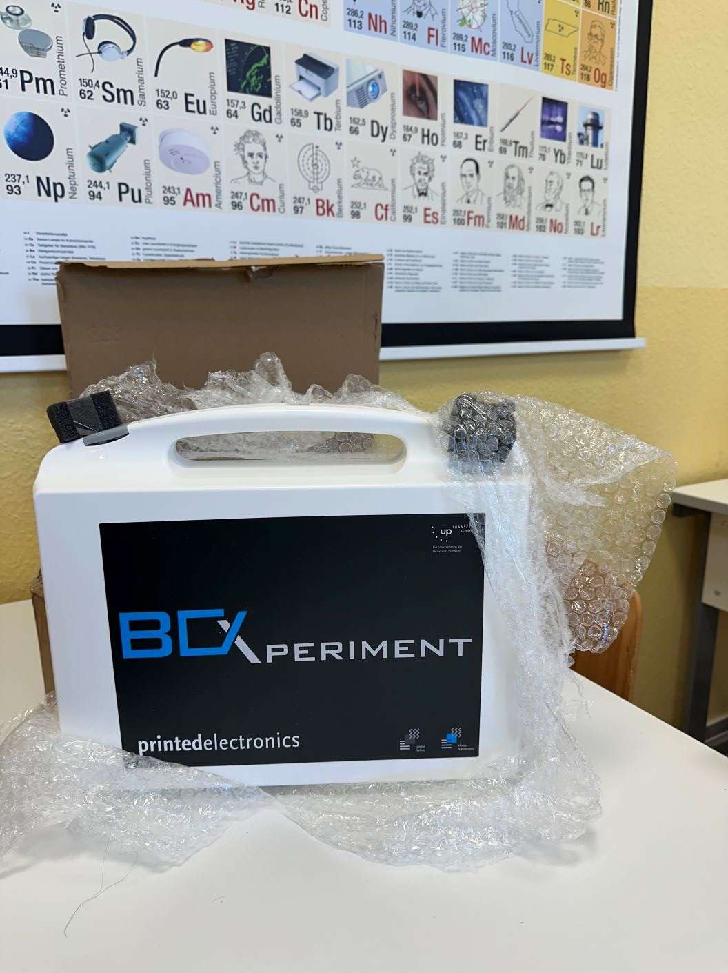 Zum anderen wurde ein Experimentierset erworben, welches von der Chemiedidaktik der Universität Potsdam entwickelt wurde. Hier geht es um gedruckte Elektronik – klingt verrückt, oder? Ist es auch, denn es handelt sich hierbei um eine zukunftsweisende Technologie. Unter gedruckter Elektronik versteht man elektronische Bauelemente, die vollständig oder teilweise mittels Druckverfahren hergestellt werden (z.B. Touchscreens). Auch können leitfähige Schichten so übereinander gedruckt werden, dass die fertigen Bauteile Licht emittieren. Die so entstehenden EL-Devices (Elektrolumineszenz) sind sehr dünn und flexibel. Einen Eindruck zu dieser Technologie gewährt die Website der Chemiedidaktik.